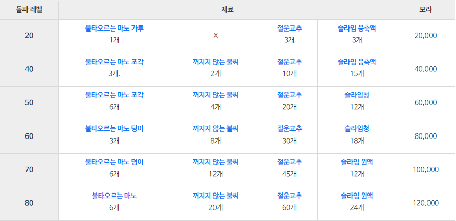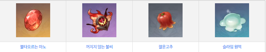 향릉 돌파재료는 불타오르는 마노, 꺼지지 않는 불씨, 절운고추, 슬라임 원액이 있습니다. 불타오르는 마노와 꺼지지 않는 불씨는 폭염나무를 잡으면 드랍하는 아이템입니다. 절운고추는 리월 특산품으로 리월지역에서 채집가능함며 슬라임원액은 슬라임을 잡으면 드랍하거나 합성해서 얻을 수 있습니다.