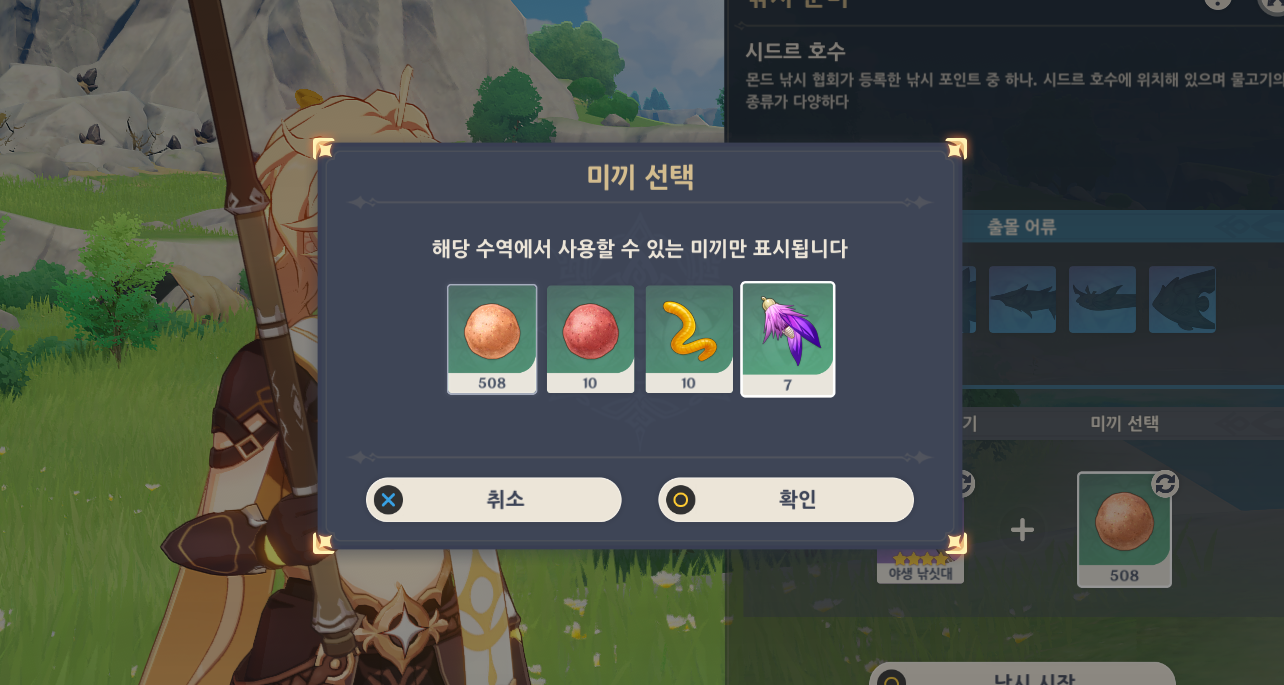 낚시 하기전에 미끼는 선택하는데 미끼는 총 4가지가 있습니다. 첫번째진열된 미끼의 레시피는 기본적으로 제공되고 나머지 3가지 미끼는 「고기떼 대폭팔」 임무를 진행하시면 샘플로 10개씩만 주고 레시피는 이후 낚시로 물고기를 잡아서 교환을 해야합니다.