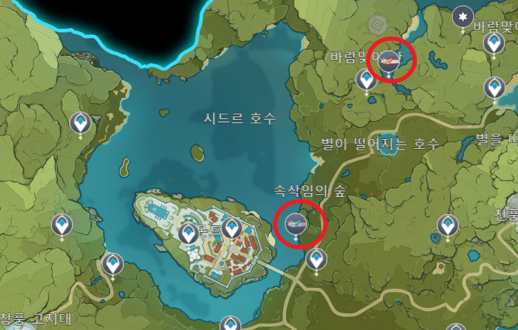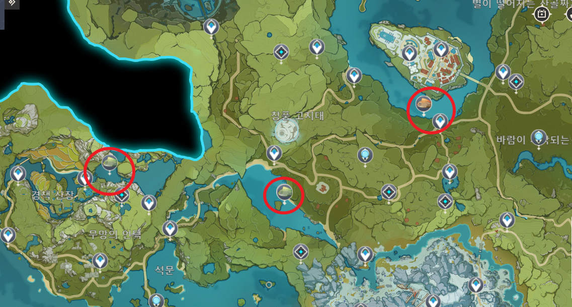 금적빛 용물고기와 녹빛 용물고기의 낚시 포인트는 총 6군데로 몬드지역에 2군데, 리월에 3군데, 이나즈마 지역에 1군데입니다.