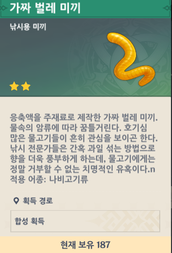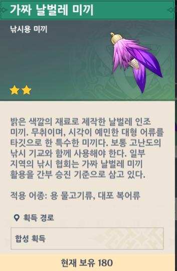 금적빛 , 녹빛 용물고기 미끼는 가짜 날벌레 미끼를 사용합니다.