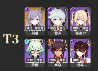 3티어 : 각청, 레이저, 피슬, 설탕, 신염, 북두입니다. 설탕과 신염을 제외하고 모두 번개원소 속성의 캐릭터입니다. 각청은 이전부터 성능의 문제로 말이 많았고 애정하시는분이 아니면 잘 키우지 않는 캐릭터입니다. 물론 4성밖에 없을경우에는 각청이 좋지만 게임을 계속하다보면 5성 좋은 메인딜러가 많기 때문에 각청은 다른 메인딜러를 뽑게 되면 자리가 밀리는 경우가 많습니다. 번개원소가 버프가 된다는 사실에 각청이 떡상할 것이라는 말이 있었으나 오히려 한티어 내려오게 된것 같습니다.