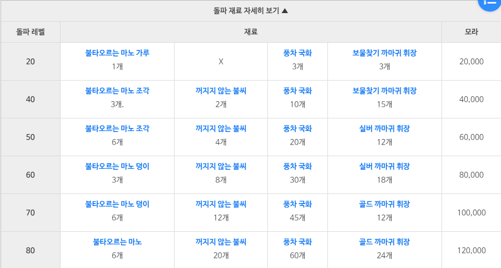 마노와 꺼지지않는 불씨는 폭염나무에서 드랍되는 아이템이며 풍차국화는 몬드지역에서 채집으로 획득가능합니다. 까마귀 휘장은 보물사냥단을 쓰러트리면 드랍하는 아이템입니다.