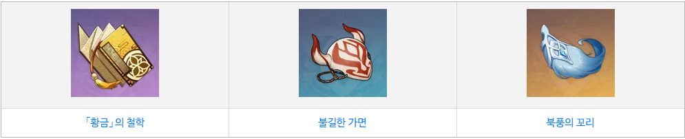 행추의 특성 레벨업 재료는 황금 책과, 레벨 돌파재료와 같은 불길한 가면, 북풍의 꼬리가 있습니다.