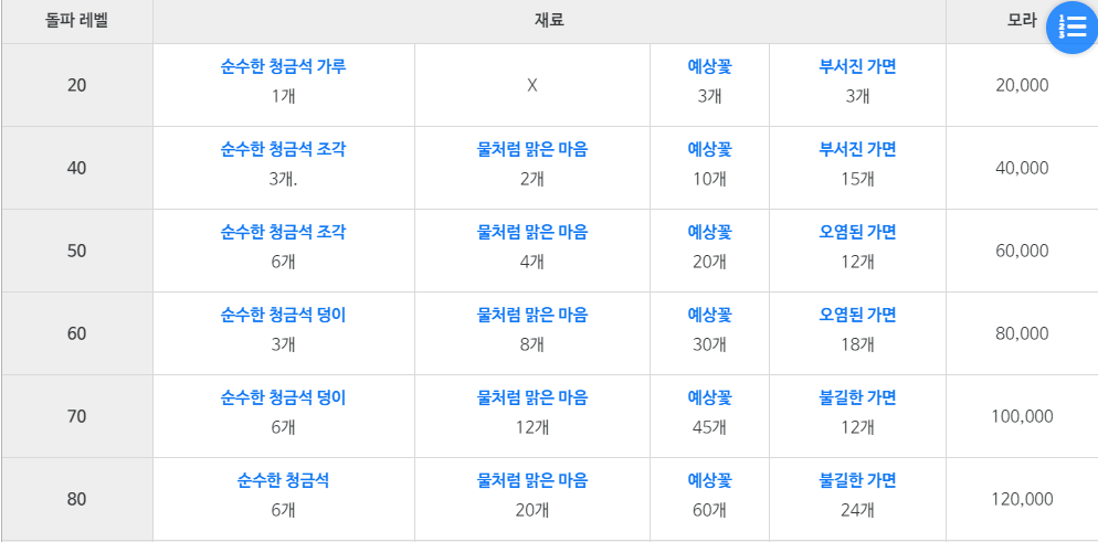 레벨돌파시 청금석, 물처럼 맑은 마음, 예상꽃, 가면(부서진,오염된 등) 의 재료가 필요 합니다. 청금석, 물처럼 맑은 마음은 물의 정령 보스 몹을 잡으면 획득가능합니다. 예상꽃은 리월지역에서 채집이 가능하며 부서진가면, 오염된가면, 불길한가면 등은 츄츄족이 드랍하는 아이템입니다.