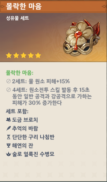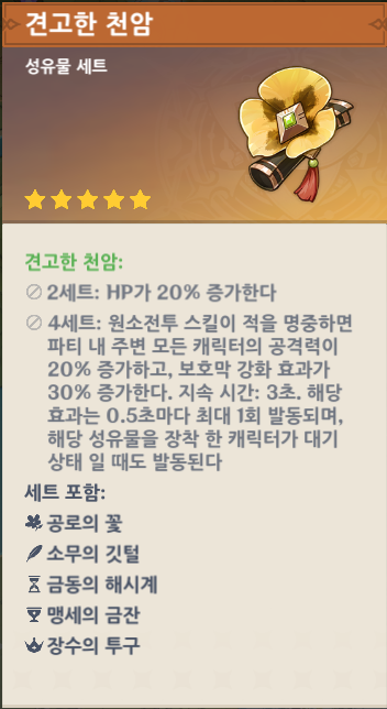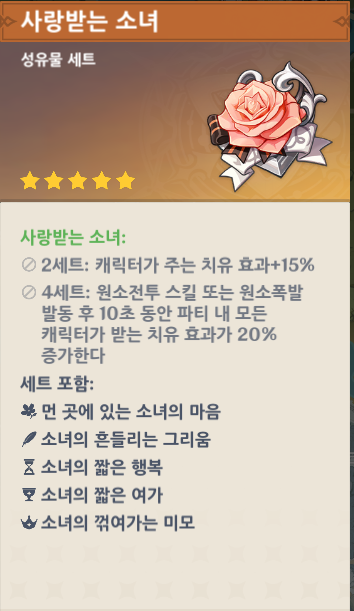치유 보너스가 10/12.5/15/17.5/20% 증가하고, 일반 공격으로 가하는 피해가 해당 장비를 장착한 캐릭터 HP 최대치의 1/1.5/2/2.5/3%만큼 증가한다. 원소폭발 발동 후 12초 내에 일반 공격으로 적을 명중하면 원소 에너지를 0.6pt 회복하고, 해당 방식으로 0.1초마다 원소 에너지를 최대 1회 회복할 수 있다