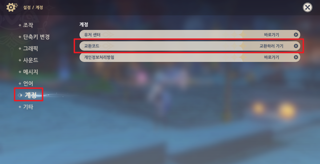 게임 내에서 설정에 들어가 '계정 > 교환코드 > 코드입력' 이 순서로 진행하시면 기재된 리딤코드에 해당되는 보상을 수령할 수 있습니다.