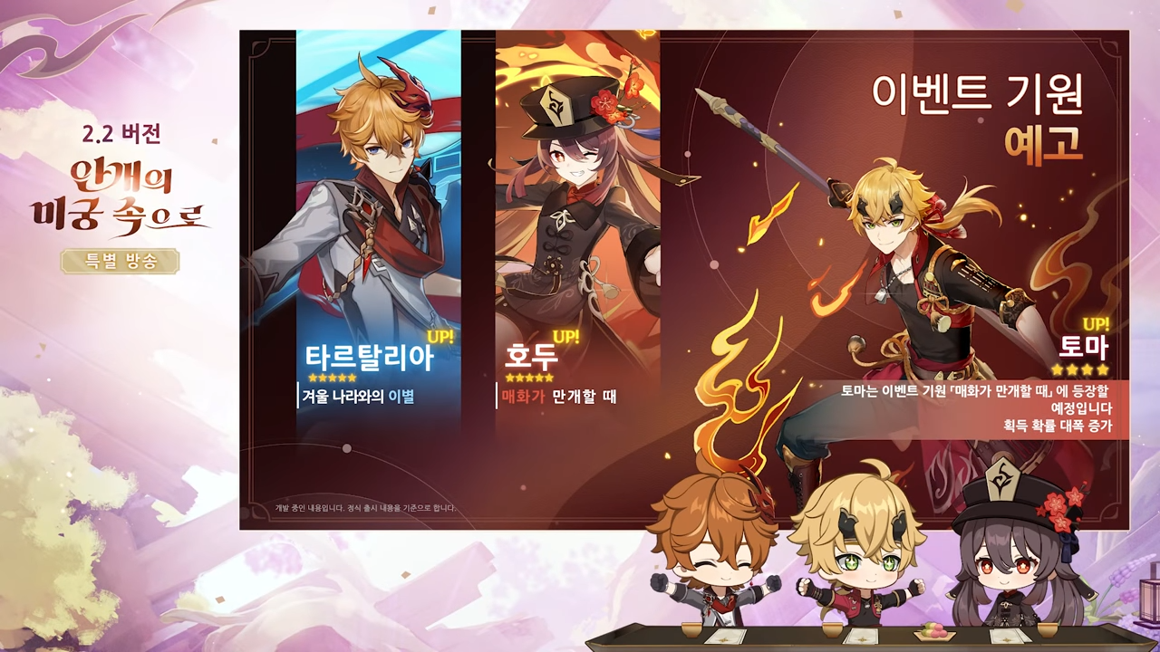 선픽업은 타르탈리아 복각(두번째복각), 후픽업은 호두와 신규캐릭터인 토마 픽업이 있습니다.