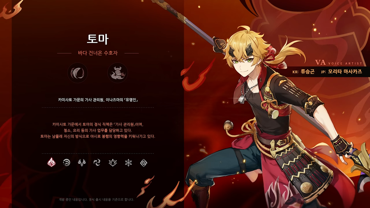토마는 이나즈마의 유명인이며 불속성 장병기 캐릭터입니다. 토마의 원소스킬은 불원소를 부착하며 캐릭터를 보호하는 타오르는 운명의 방패를 소환하며 이 보호막의 피해 흡수량은 누적됩니다. 토마의 원소폭팔 스킬은 타오르는 화염으로 주변의 적을 베고 불원소 범위 피해를 줍니다.
