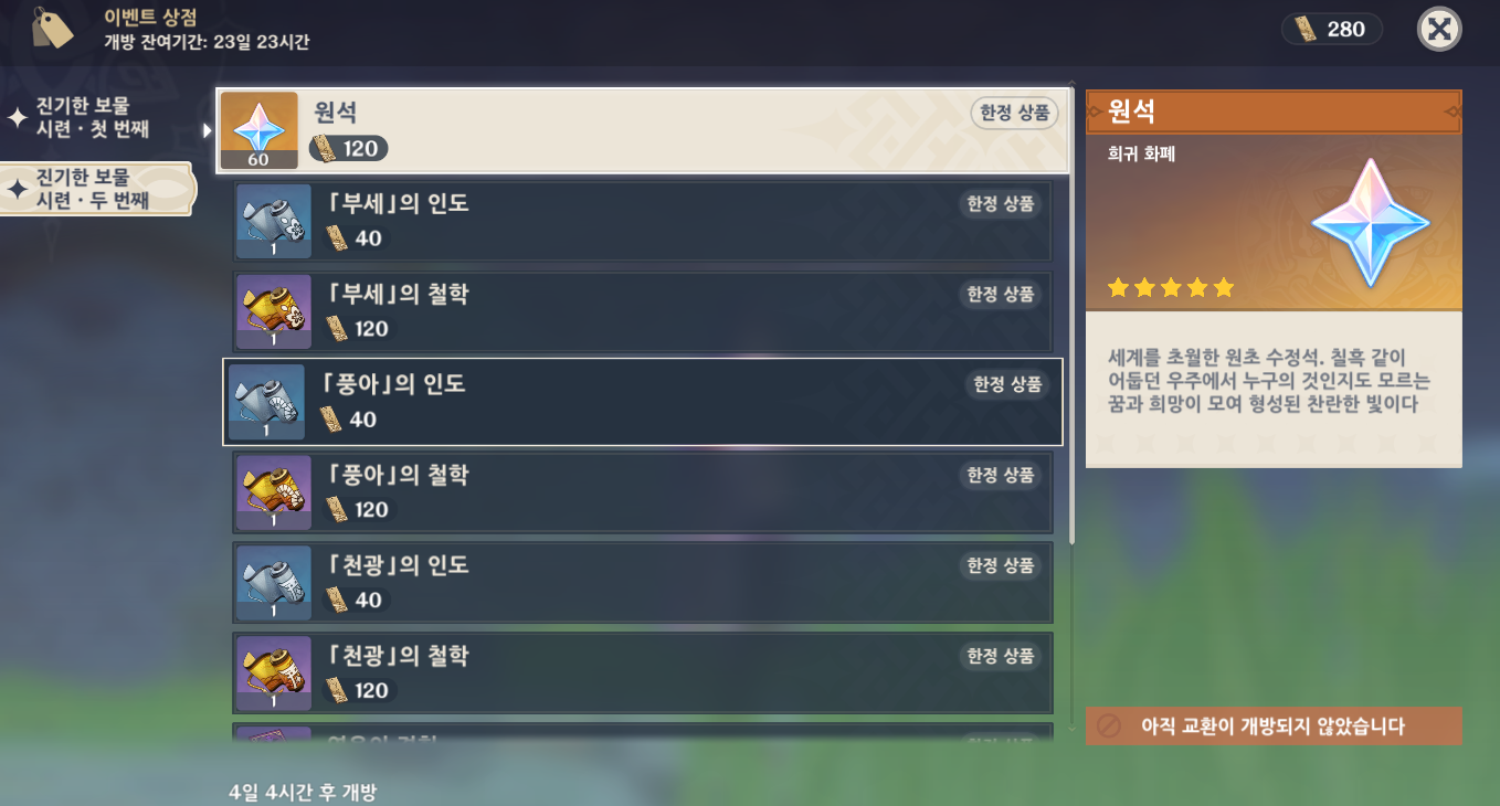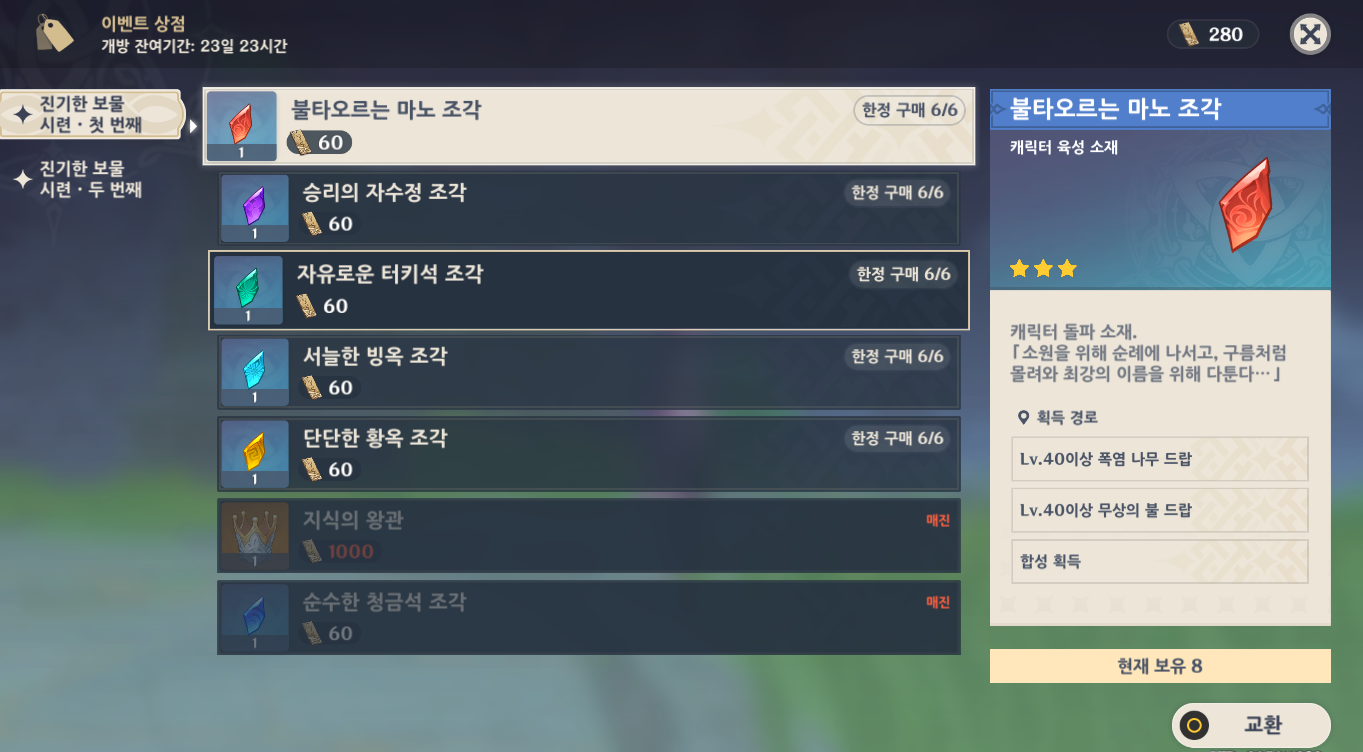이벤트 상점에는 속성 조각, 지식의 왕관, 특성 재료, 원석, 경험치재료, 무기재료, 모라 등 교환이 가능합니다.