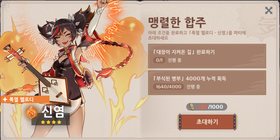 '대장이 지켜온길', '부식된 병부' 4000개 누적 획득 두개의 조건을 만족하면 신염을 초대할 수 있습니다.