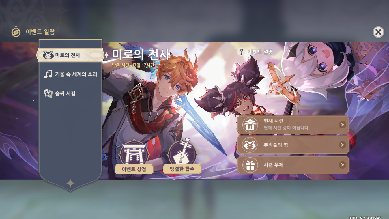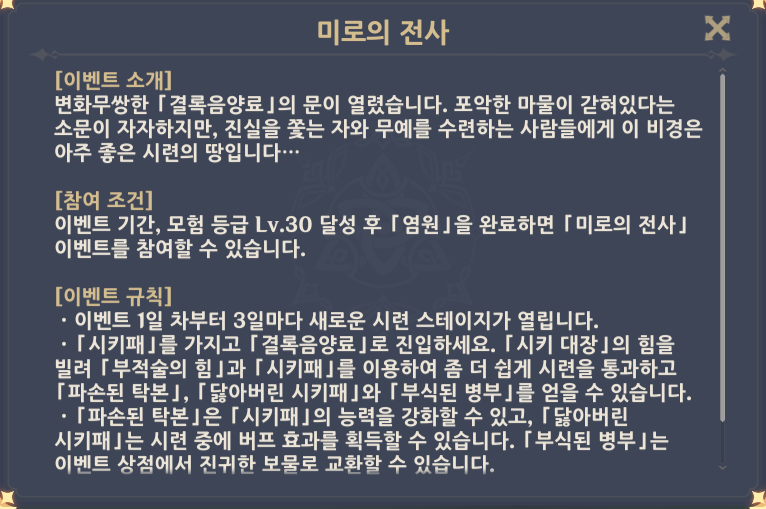 새로 열린 미로의 전사는 모험레벨 30레벨이 이상이여야 하며 모험레벨이 30레벨이 넘어도 이나즈마 스토리인 염원을 완료하지 못하여 이벤트에 참여할 수 없습니다. 대부분의 이벤트가 '염원'을 완료한다는 조건을 달고 있어 스토리를 미루고 있으신 분들이라면 스토리를 빨리 밀고 이벤트를 하는 것이 더 이득인 것 같습니다.