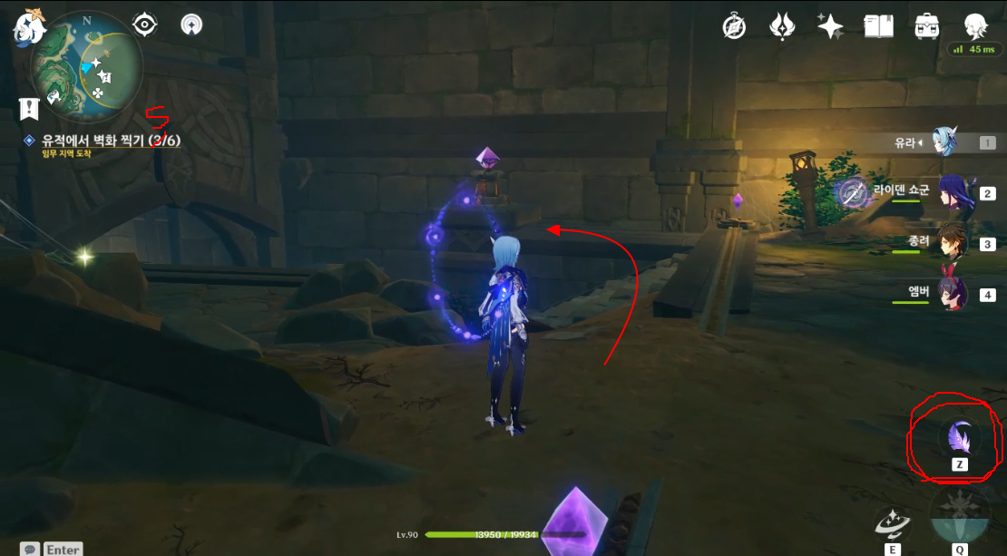 두번째방에서 사진을 찍고나와서 세번째 방으로 이동하면 유적에서 벽화찍기(4/6)으로 되어 있어야 합니다. 또다시 사진처럼 빛나는 기둥이 있는 위치에서 사진을 찍어주면 됩니다.