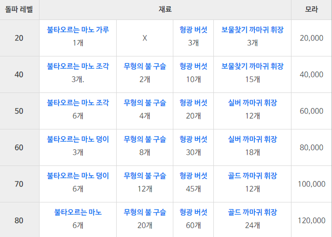 - 불타오르는 마노 : LV.75이상 「폭염나무」 드랍, 불타오르는 마노 가루, 조각, 덩이 합성획득 가능