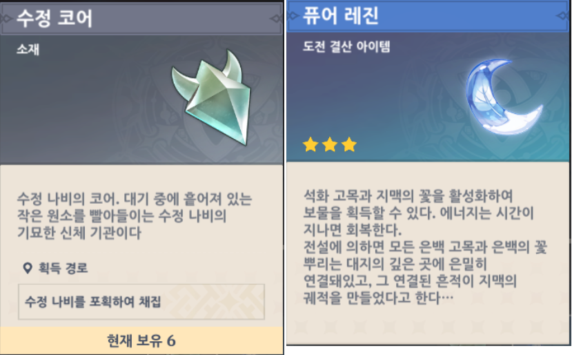 수정코어는 수정나비를 잡으면 얻을 수 있고 퓨어레진은 시간이지나면 충전되거나 약한레진이나 원석을 사용해서 충전을 할 수 있습니다.