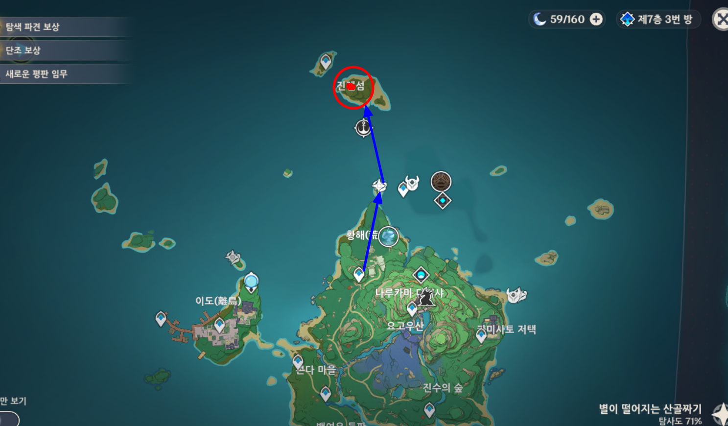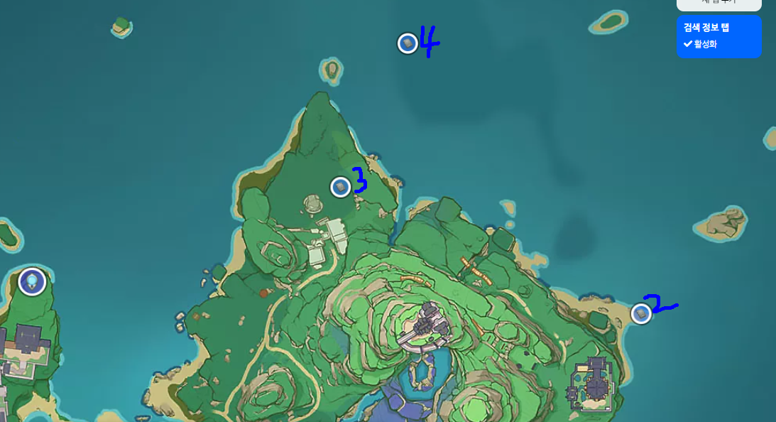 이나즈마에 있는 진렌섬에 있는 npc를 만나야합니다. 진렌섬에 처음가시는 분들은 파란색 루트로 가면 됩니다.