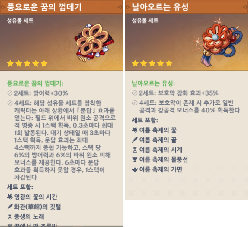 2.3버전 업데이트에 새로추가된 성유물입니다. 방어력 기반 바위 원소 캐릭터 특화된 성유물 세트로 이토에게 최적화된 성유물입니다.