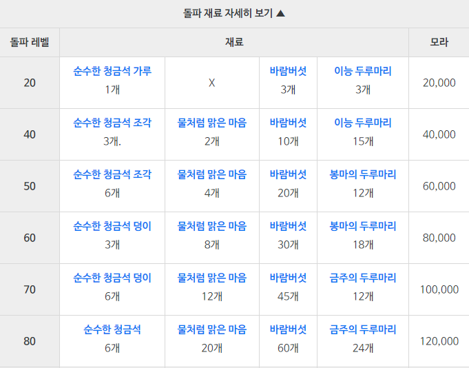 순수한 청금석 : LV.75 이상 물의 정령 드랍, 순수한 청금석 가루, 조각, 덩이 합성 획득