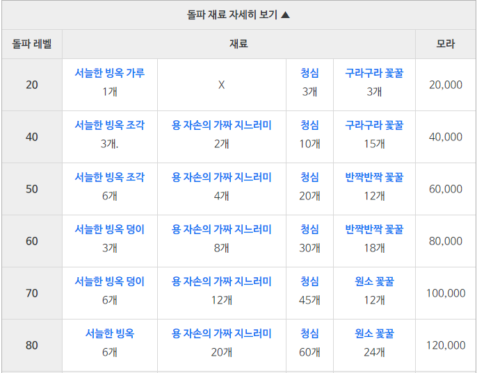 서늘한 빙옥 : LV.75 이상 얼음 나무 드랍, 서늘한 빙옥 가루, 빙옥조각, 빙옥 덩이 합성 획득 가능