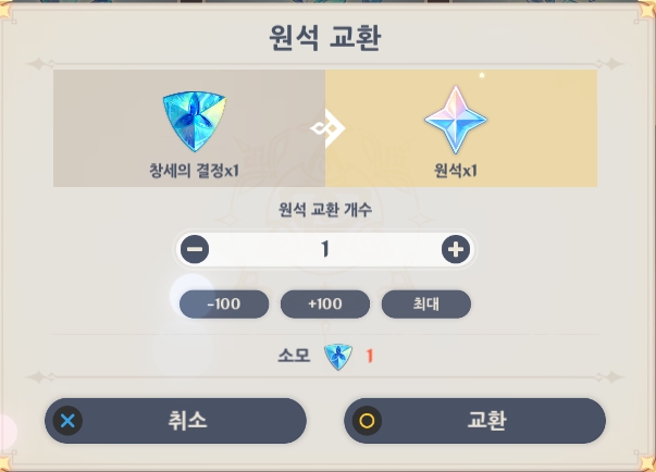 창세의 결정을 구매하셨다면 원석 개수 옆에 + 버튼을 눌리면 창세의 결정을 원석으로 바꿀수 있는 화면이 뜹니다