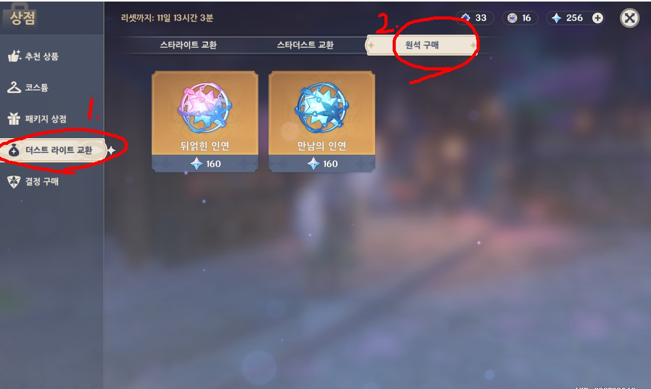 '상점 -> 더스트 라이트 교환 -> 원석 구매' 페이지에서 원석으로 뒤얽힌 인연을 구입하면 됩니다.