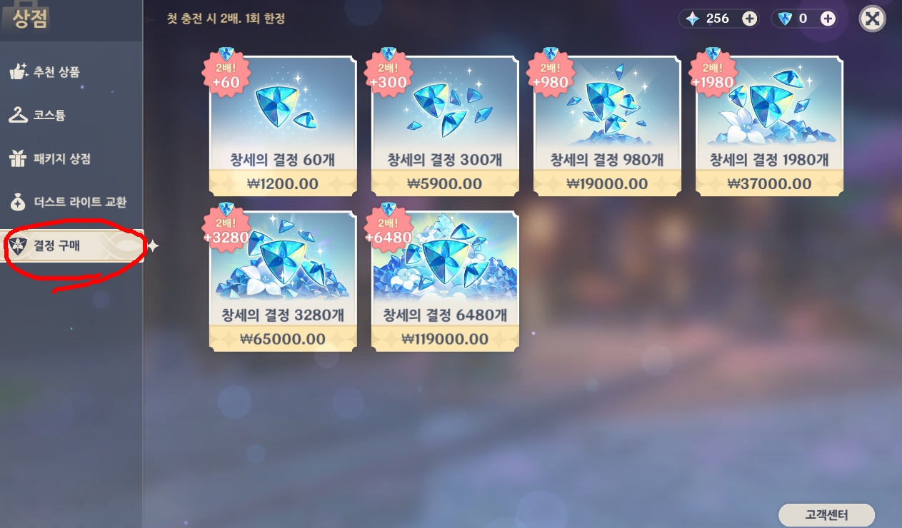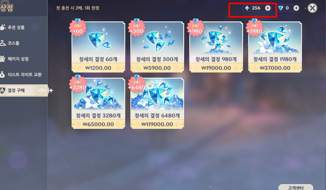 상점에서 창세의 결정 구매