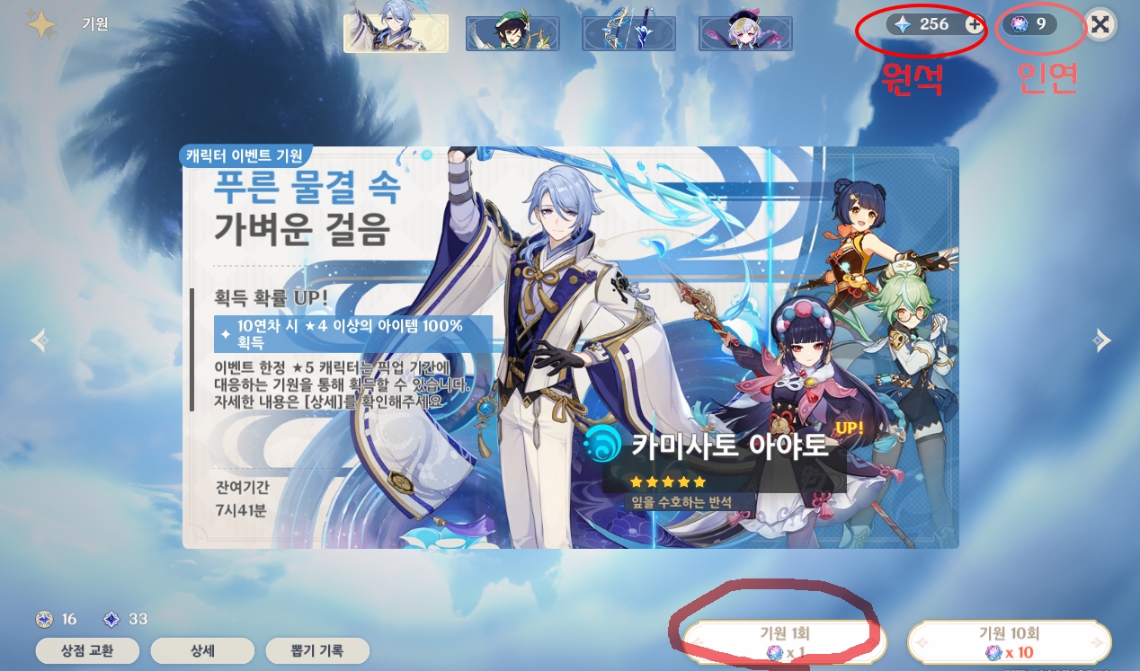 캐릭터나 무기 이벤트 기원을하기 위해서는 (기원=뽑기) 위 사진처럼 생긴 인연이 필요합니다. 인연1개당 뽑기1회 가능합니다.