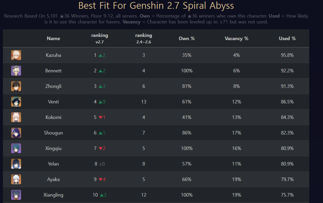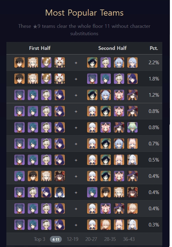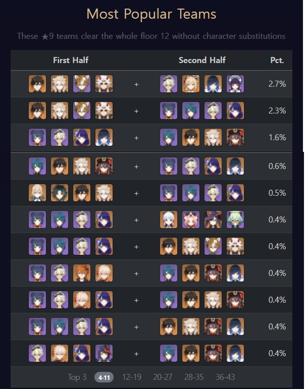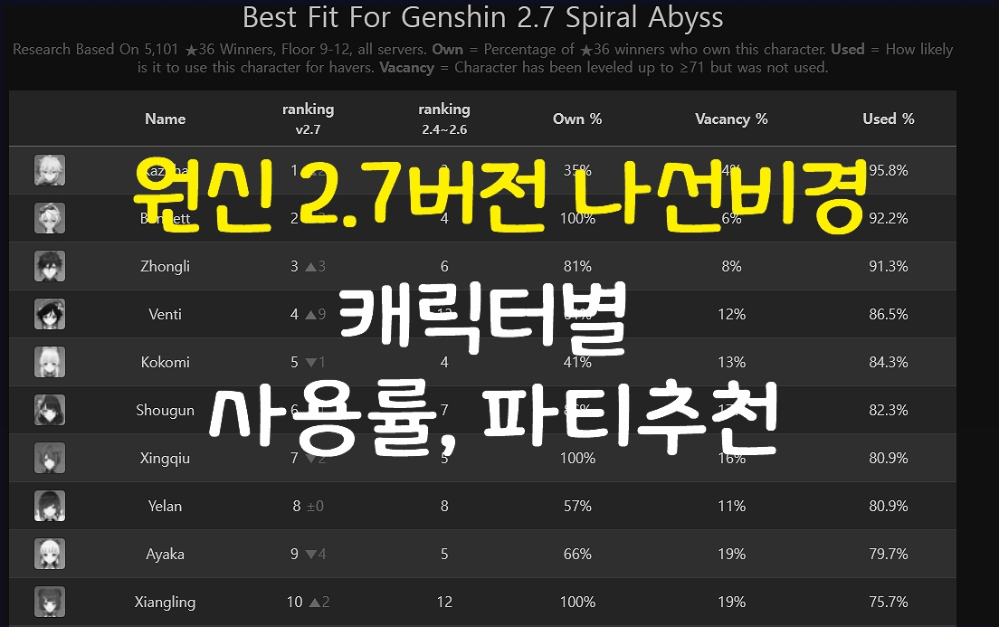 2.7버전 나선비경 캐릭터별 사용률, 나선비경 층별 파티추천 최신(야란 포함)