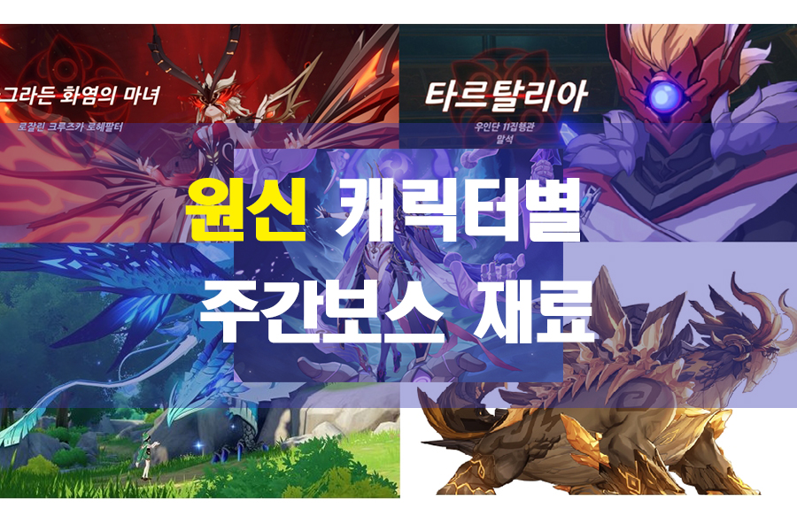 원신 게임에서 캐릭터 육성시 특성레벨을 올리고자할때 어느레벨 이상부터는 주간보스 재료가 필요합니다. 주간보스 재료종류별로 어떤 캐릭터들이 사용하는지 최신버전 자료기준으로 정리해보았습니다.