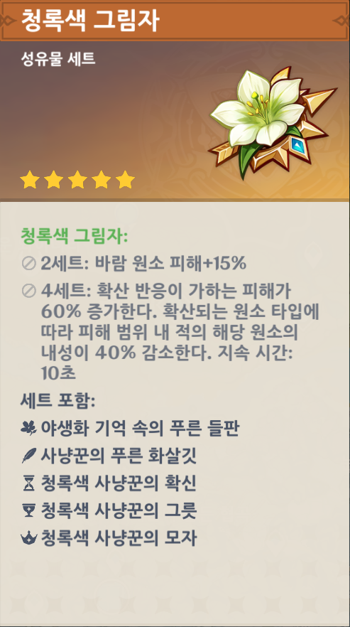 바람 속을 유랑하는 「천년의 대악장」의 일부분이다. 가하는 피해가 10/12.5/15/17.5/20% 증가한다. 원소 반응을 발동할 때 캐릭터는 투쟁 부적을 한 장 획득한다. 0.5초마다 한 번 발동한다. 캐릭터가 대기 상태일 때도 발동 할 수 있다. 투쟁 부적 2장 보유 시, 2장의 부적을 모두 사용하여 파티 내 모든 캐릭터가 12초동안 「천년의 대악장·투쟁의 노래」 효과를 획득한다. 일반 공격, 강공격, 낙하 공격 피해가 16/20/24/28/32% 증가하고, 공격력이 20/25/30/35/40% 증가한다. 발동 후 20초 동안은 투쟁 부적을 획득할 수 없다. 「천년의 대악장」의 발동 효과는 동일한 수치의 다른 효과들과 중첩되지 않는다