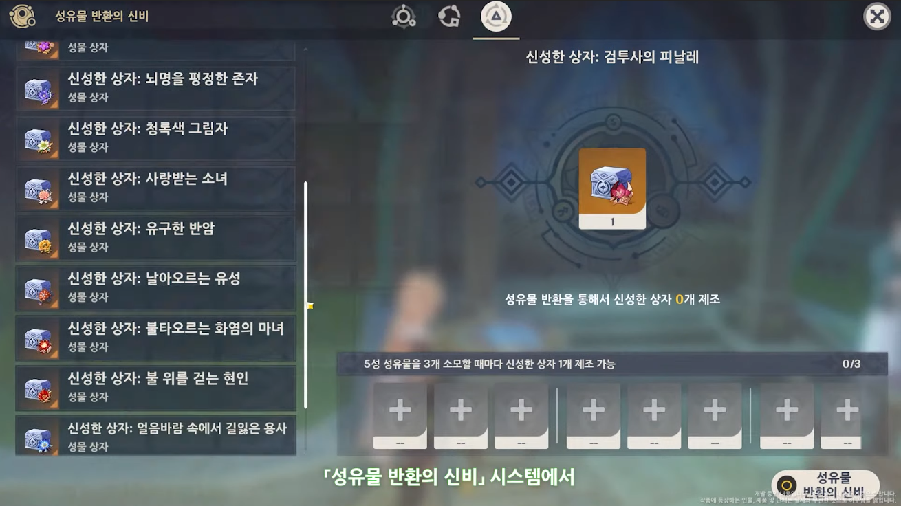 1.2버전 전 업데이트한 모든 5성 성유물을 「성유물반환의 신비」 시스템에서 전환을 통해 획득할 수 있습니다.