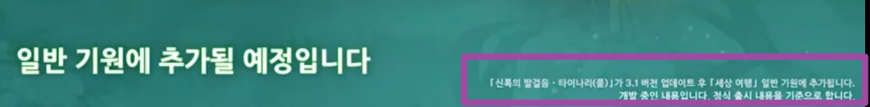 ※주의 하실점은 3.0버전 전반픽업에 진행 되는 신규 5성 풀속성 캐릭터 타이나리는 3.1버전부터 일반기원에 추가된다고 하니 참고하셔야할 것 같습니다.