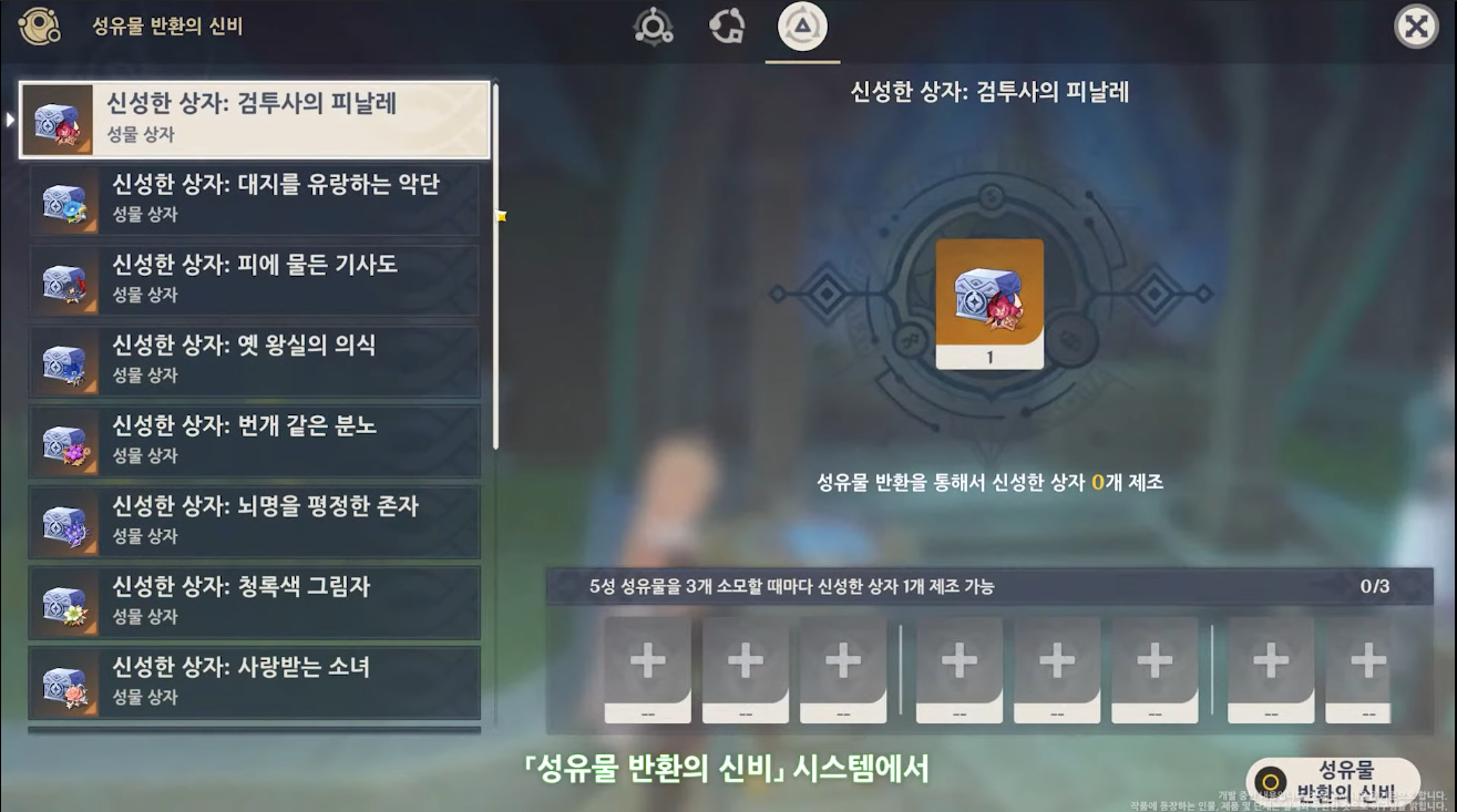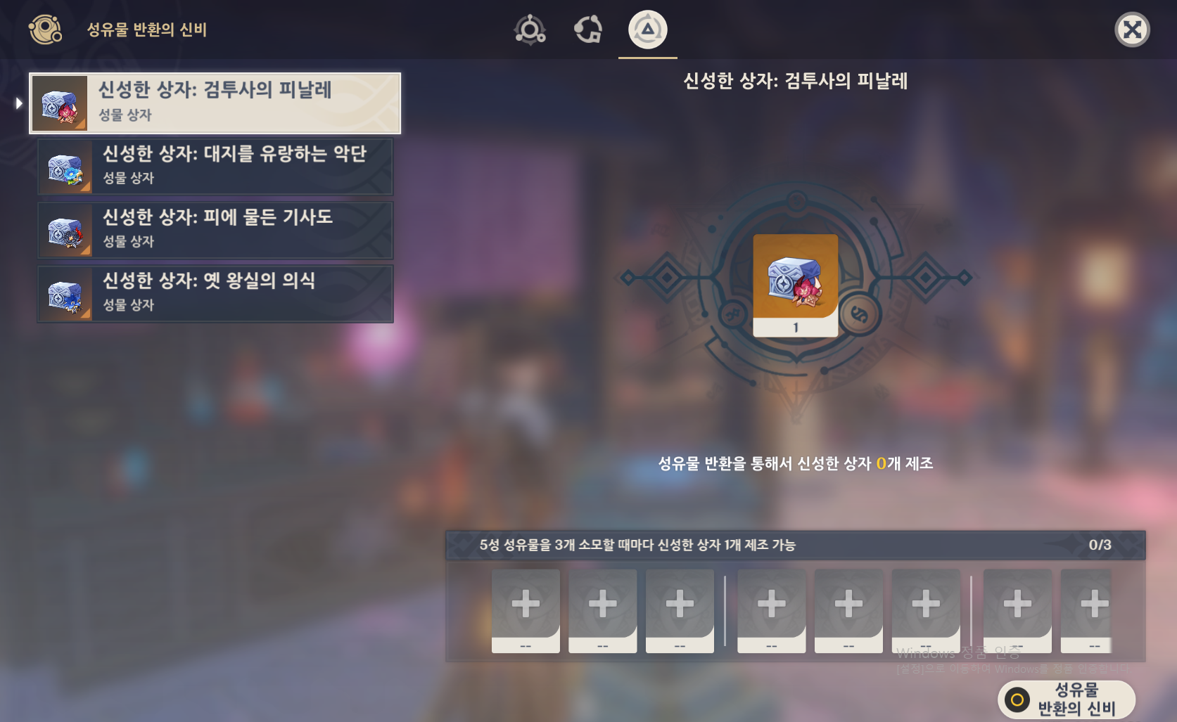 2.8버전 기준으로 검투사,악단,기사도,왕실 4개의 성유물만 반환가능했지만 3.0 버전 업데이트 이후로는 변환가능한 성유물이 늘어난다고 합니다.