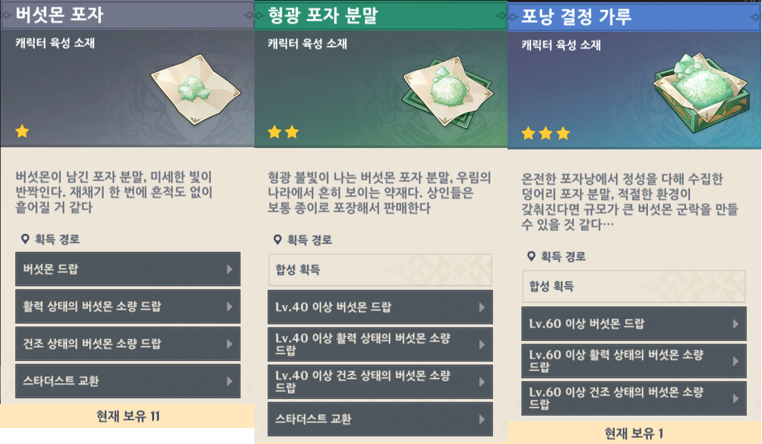 포낭 결정 가루 : LV.60 이상 둥실 물 버섯 드랍, 합성 획득