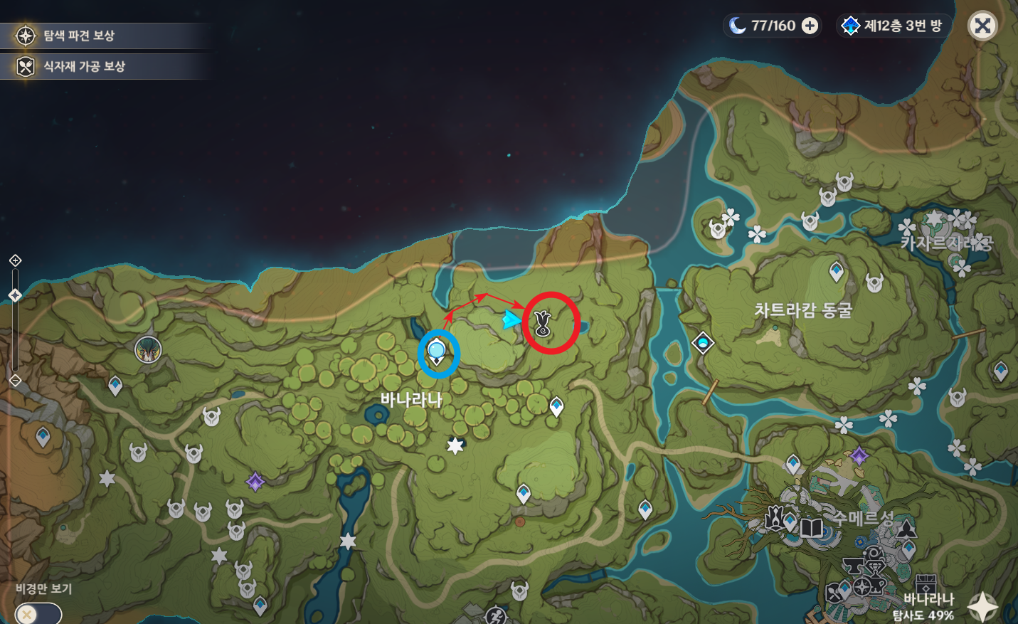 바나라나의 꿈나무 위치는 빨간색 동그라미 친 곳입니다. 꿈나무로 가기 위해서 우선 바나라나에 위치한 일곱신상으로 워프해줍니다.