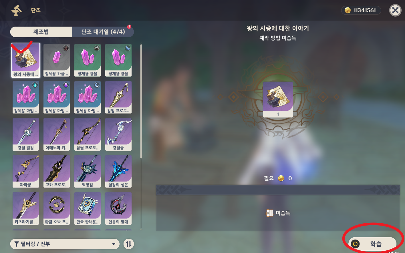 레시피를 교환후 가방에서 사용을 눌러줍니다. 그리고 단조가 가능한 대장간으로 가서 단조의뢰-> 제조법에서 학습을 클릭하면 단조가 가능해집니다.