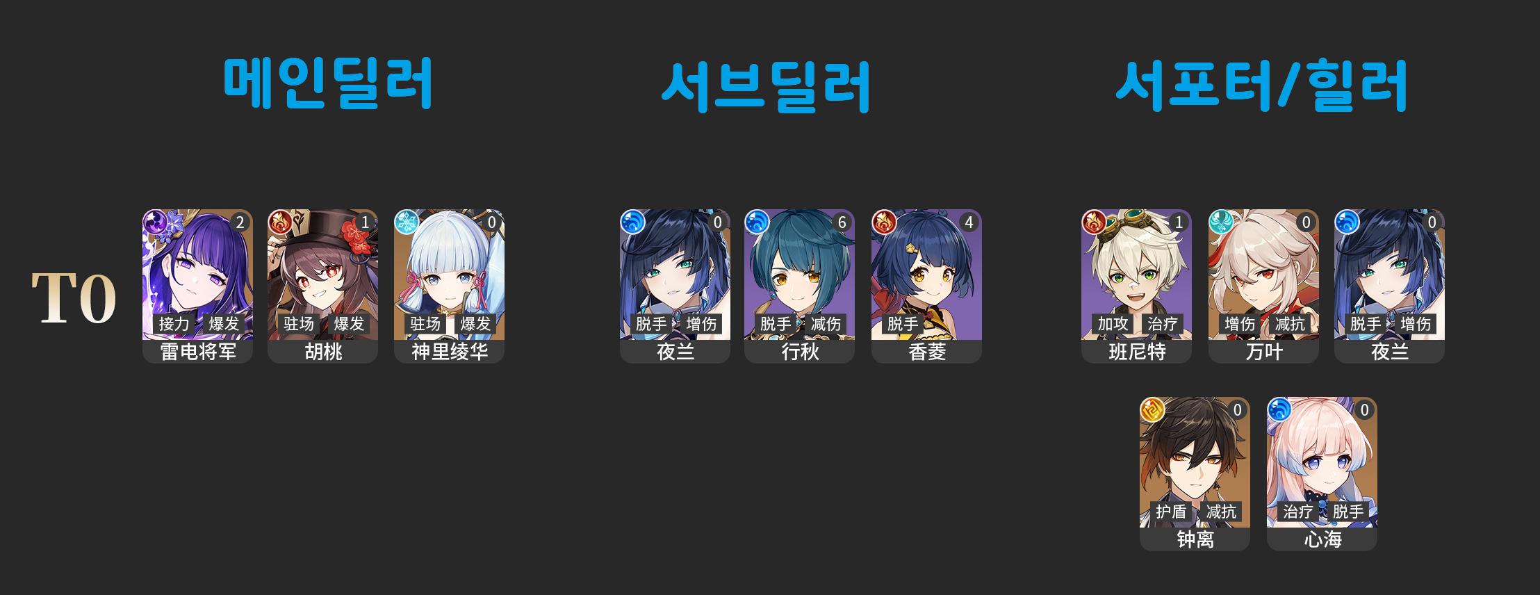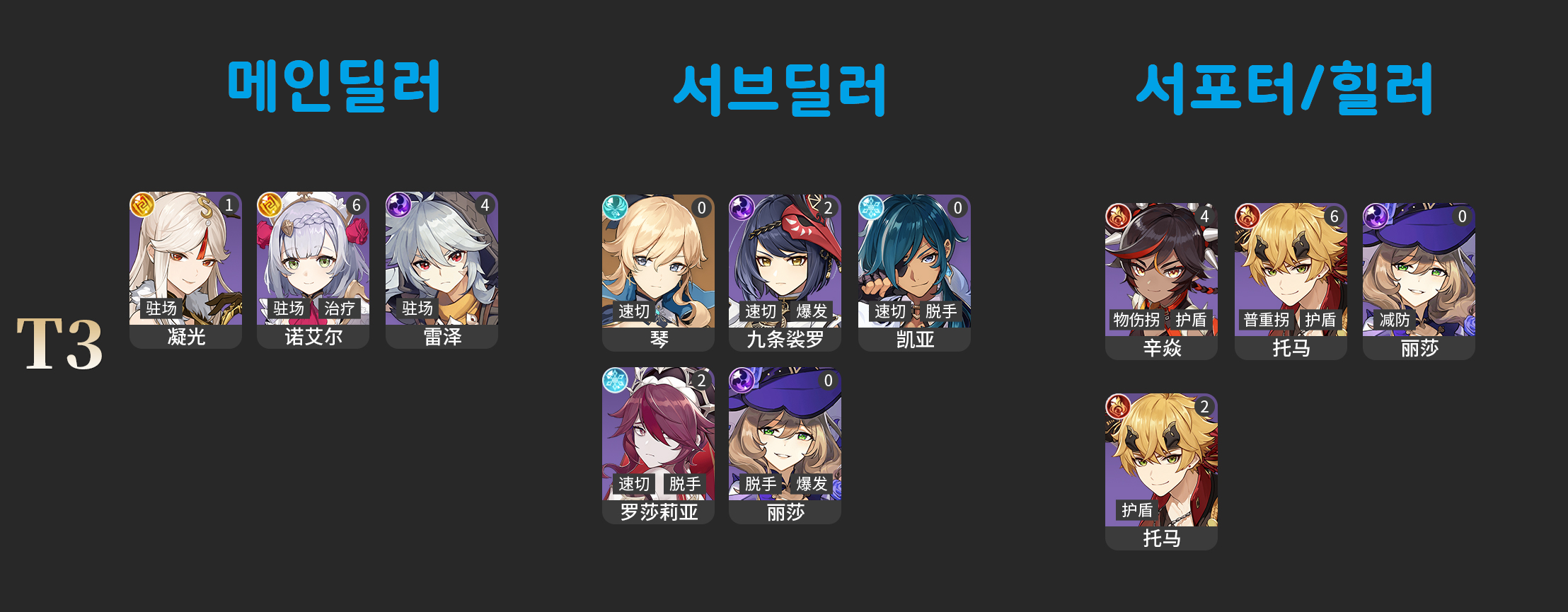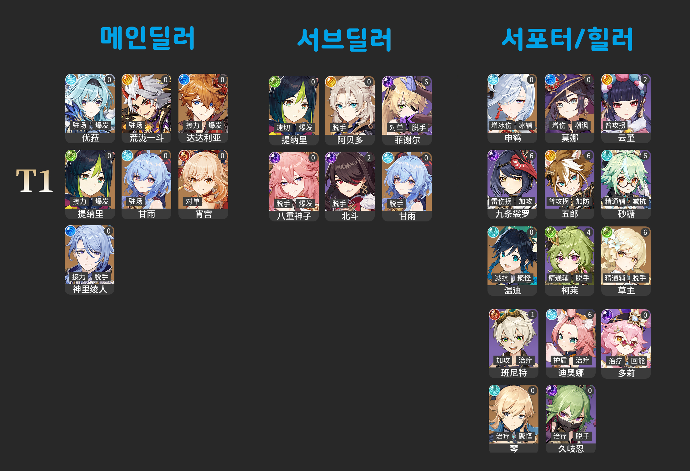 * 같은 캐릭터라도 포지션에따라 티어/등급이 다를수 있다는점 참고바랍니다. 바람 몹몰이 캐릭터 '벤티' 같은경우도 서포터로는 1티어/S등급이지만 서브딜러로는 2티어/A등급입니다. 이럴경우는 서브딜러로 사용가능하지만 서포터로 사용하면 좋은 캐릭터라는 의미입니다.