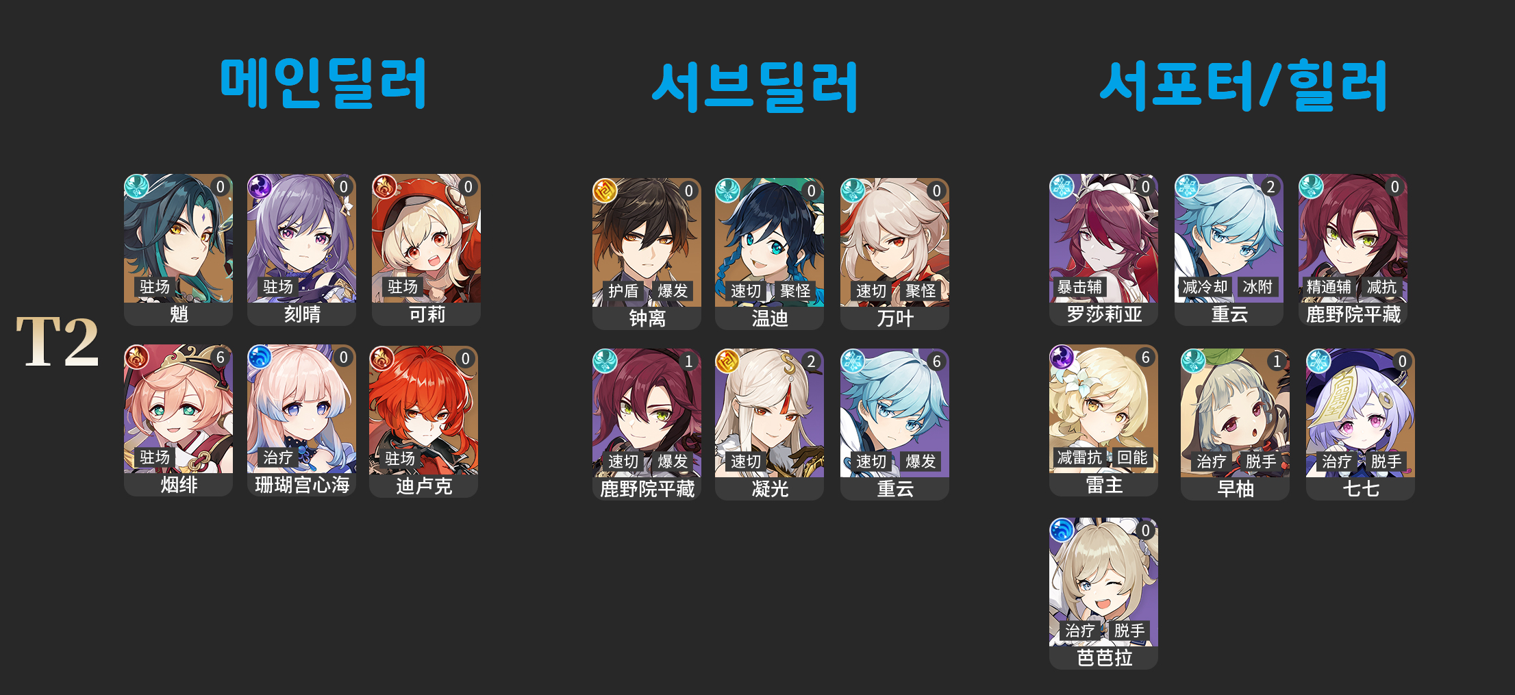 서브딜러 : 종려(바위), 벤티(바람), 카즈하(바람), 헤이조(바람), 응광(바위), 중운(얼음)