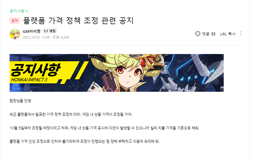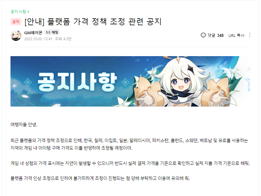 원신 공식카페의 공지사항에 플랫폼 가격 정책조정으로 인해 아이템 가격이 인상된다는 안내글이 올라와서 현재 이용자들 사이에서는 큰 이슈가 되고 있습니다.