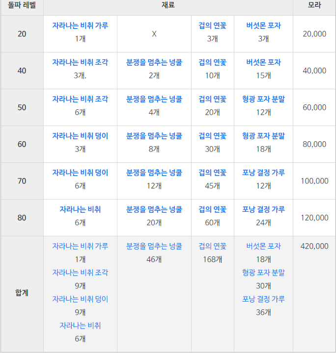 포낭 결정 가루 : Lv.60 이상 버섯몬 드랍, Lv.60 이상 활력,건조 상태의 버섯몬 소량 드랍
