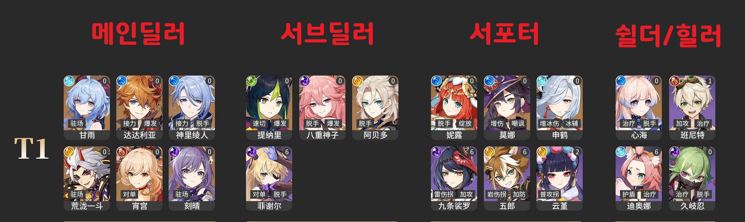 * 같은 캐릭터라도 포지션에따라 티어/등급이 다를수 있다는점 참고바랍니다. 메인딜러 얼음 캐릭터 '감우' 같은경우도 메인딜러로는 1티어/S등급이지만 서브딜러로는 2티어/A등급입니다. 이럴경우는 서브딜러로 사용가능하지만 메인딜러로 사용하면 좋은 캐릭터라는 의미입니다.