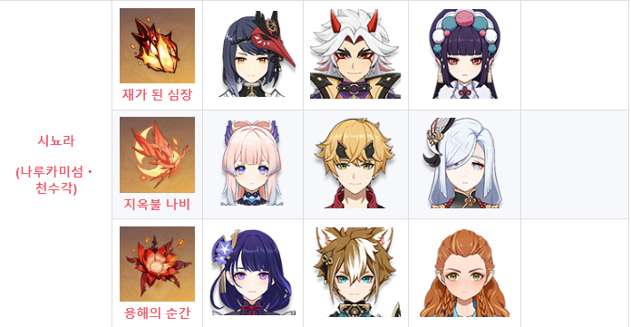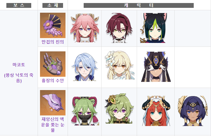 원신 캐릭터별 주간보스 재료 정리, 특성재료 (3.3버전 기준)