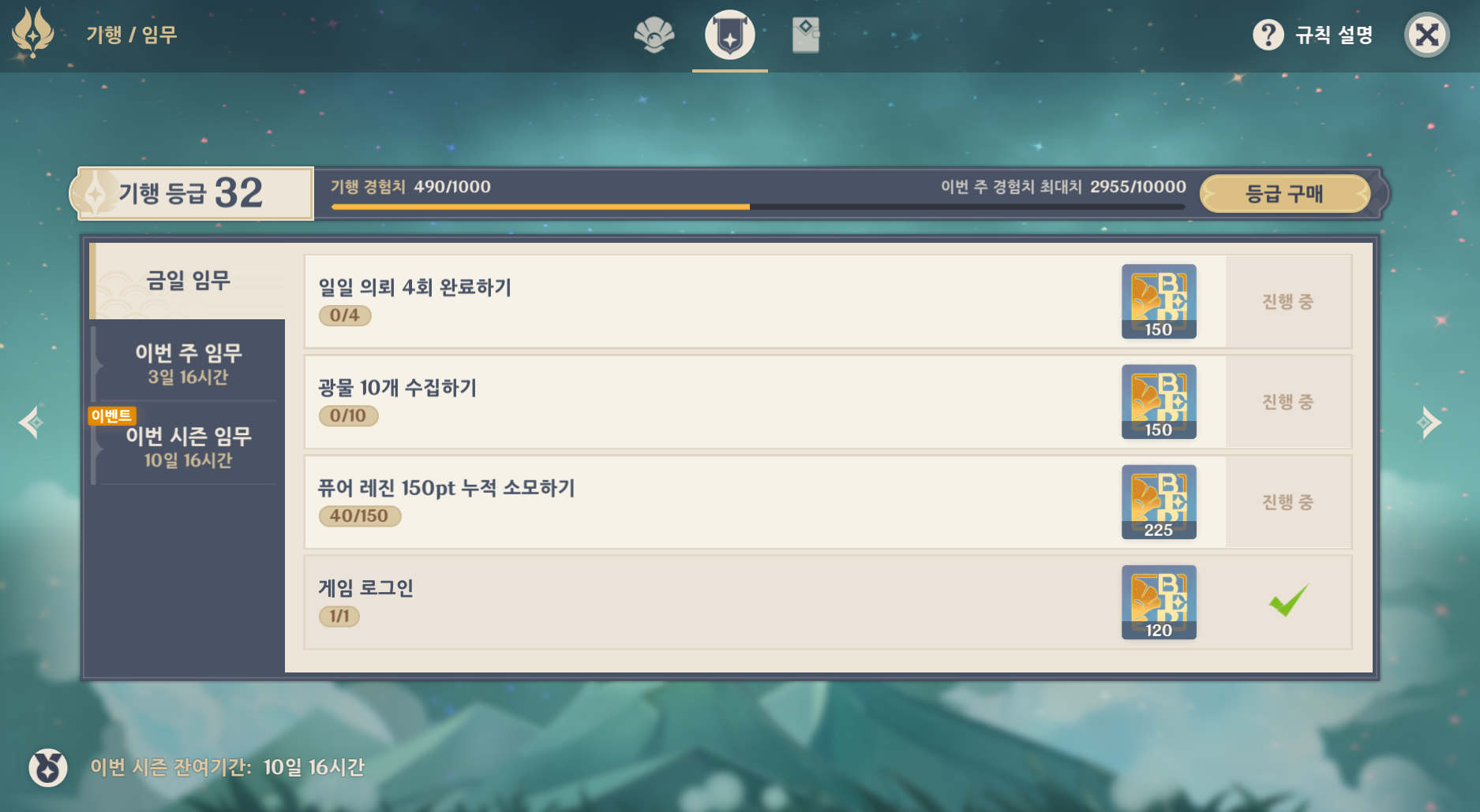 그리고 캐릭터를 한참육성할 때는 육성소재, 재화가 끊임없이 부족해지는데 진주 기행으로 소재와 재호를 얻으면 상당히 편합니다.