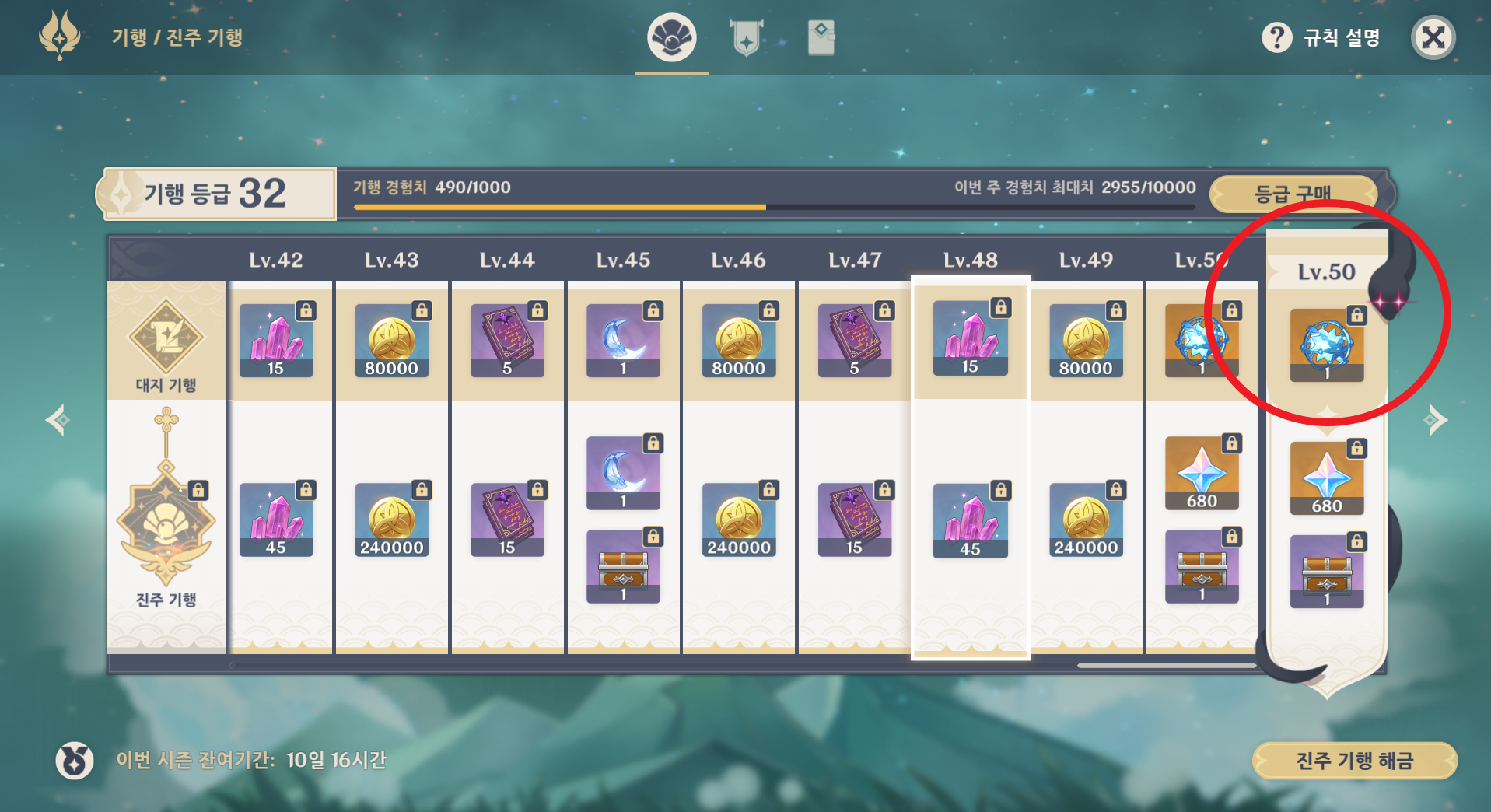 참고로 기행레벨이 어느정도 올릴수 있을지 확신할 수 없다면 기행레벨을 모두 올리고 나서 진주기행을 구매해 보상을 한꺼번에 받아도 됩니다. 저는 기행레벨을 모두 올려놓고 진주기행을 구매하여 보상을 일괄적으로 받는 편입니다.