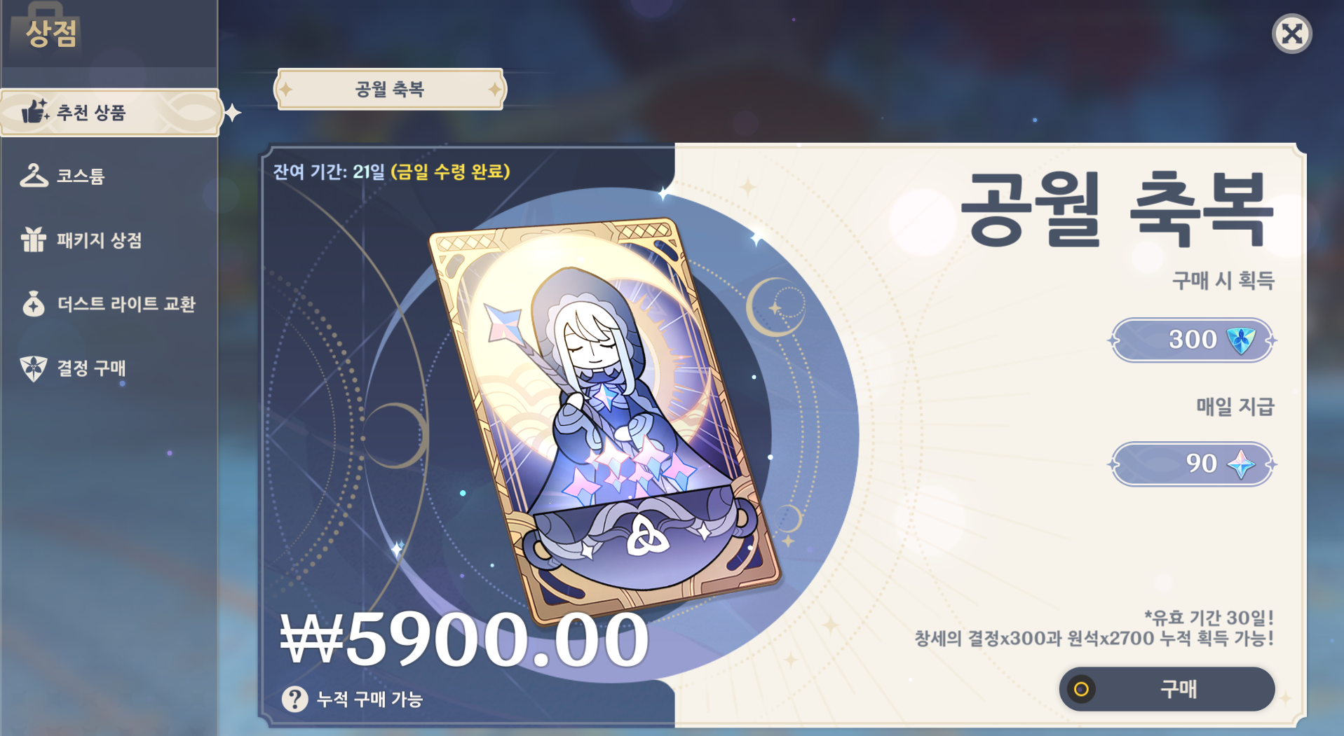 공월 축복은 원신에서 가장 기본으로 여겨지는 과금입니다. 결정을 구매하는 것보다 금액대비 효율이 가장 좋습니다.