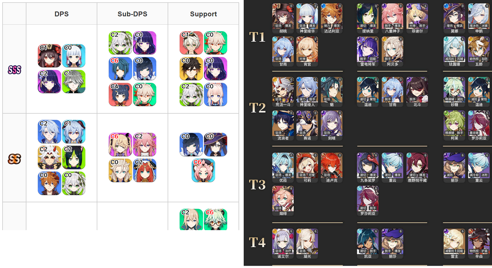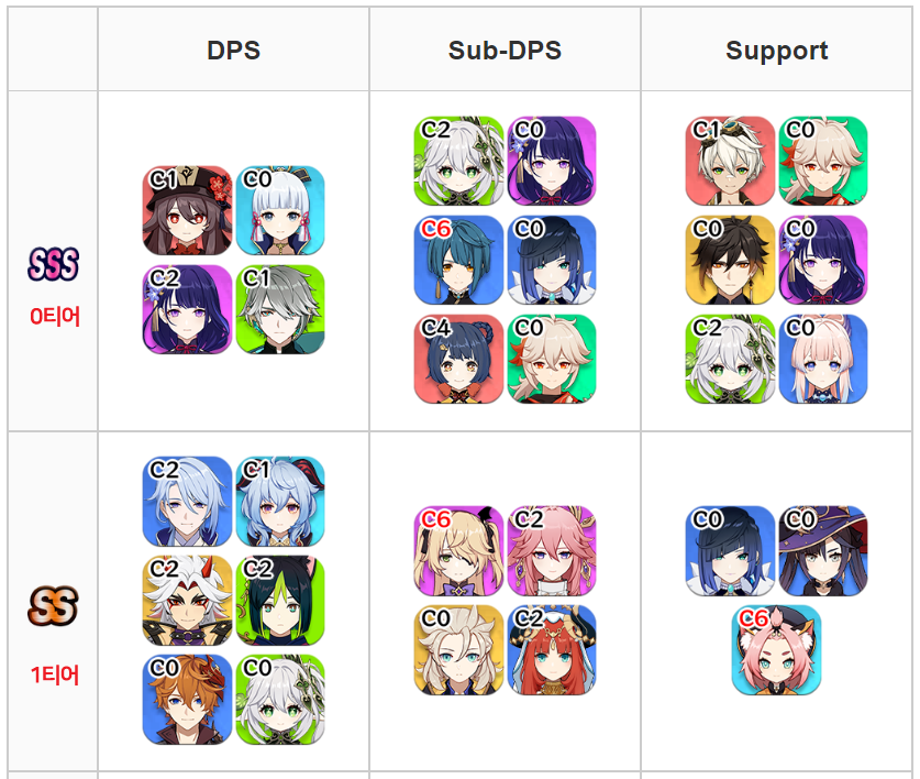 북미 티어표는 중국과 차이가 있습니다. 세세한 분류는 차이가 있지만 0티어로 분류된 캐릭터들은 어느정도 비슷한것 같습니다. 원신 고인물이라면 어느정도 감안해서 보겠지만 이제 막 입문한 초보자들은 어디까지나 참고만하시고 맹신하지 않는것을 권장드립니다