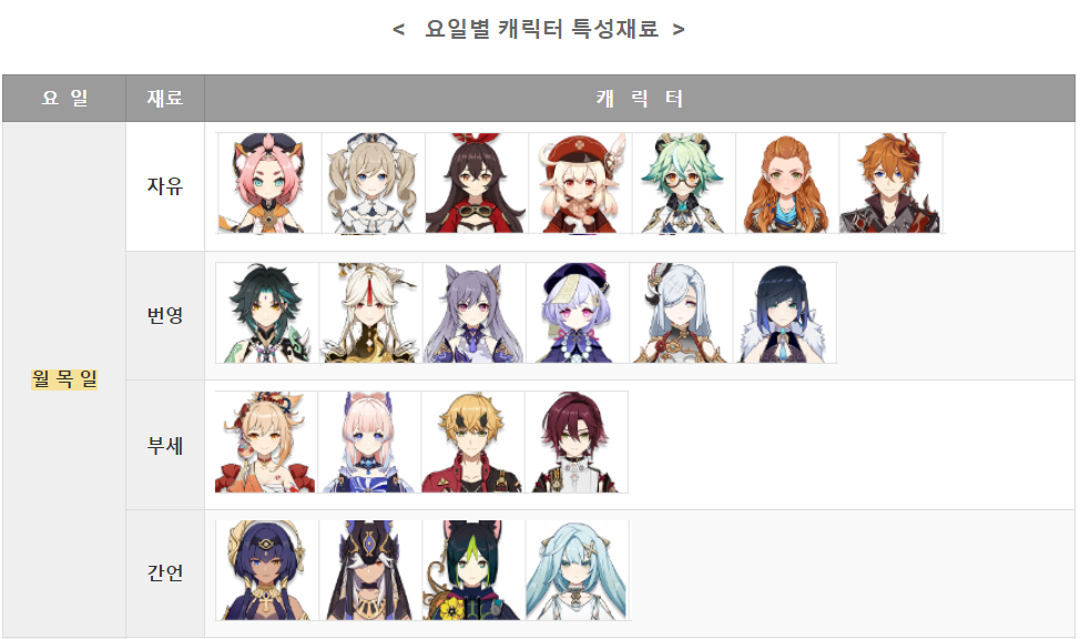 원신 요일별 캐릭터 특성 레벨업 재료(3.5버전 기준)
