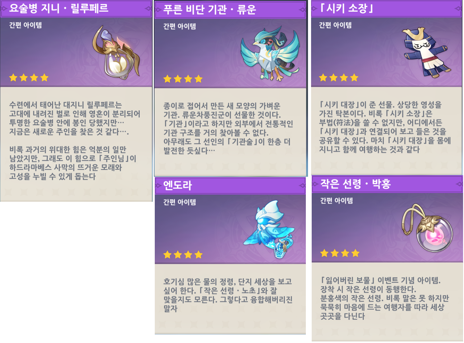원신 펫 종류 얻는방법(선령, 엔도라, 시키소장, 요술병지니, 푸른비단기관류운)