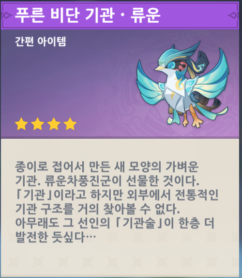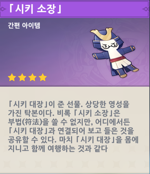 게임 출시 2주년을 맞이해 지급된 간편 아이템. 류운차풍진군이 개발하고 선물했다는 설정의 펫이며 활공 모션, 축하 모션까지 공들여서 만들어졌습니다. 시키소장과 마찬가지로 소리를 내지 않는게 장점입니다.