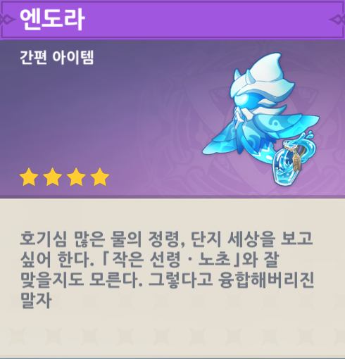 1.4버전 이벤트 물의 소원을 통해 얻을 수 있는 펫, 시도때도 없이 큰 소리를 내는 작은 선령들과는 달리 조용한 편이며, 공중에 누워서 잠을 자는 등 엔도라 특유의 행동을 취합니다.