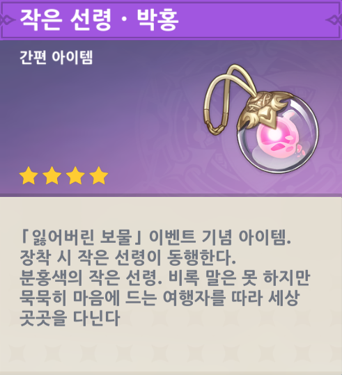 원신에서 펫은 아이템 장착시 펫이 플레이어 곁을 둥둥 떠다니며 따라다닙니다. 투 같은 특별한 기능은 없지만 주기적으로 소리를 내면 움직이기도 하고, 스토리 대화창에서도 사라지지 않고 계속 나옵니다. 대체로 특정 이벤트를 통해서 얻을 수 있습니다.